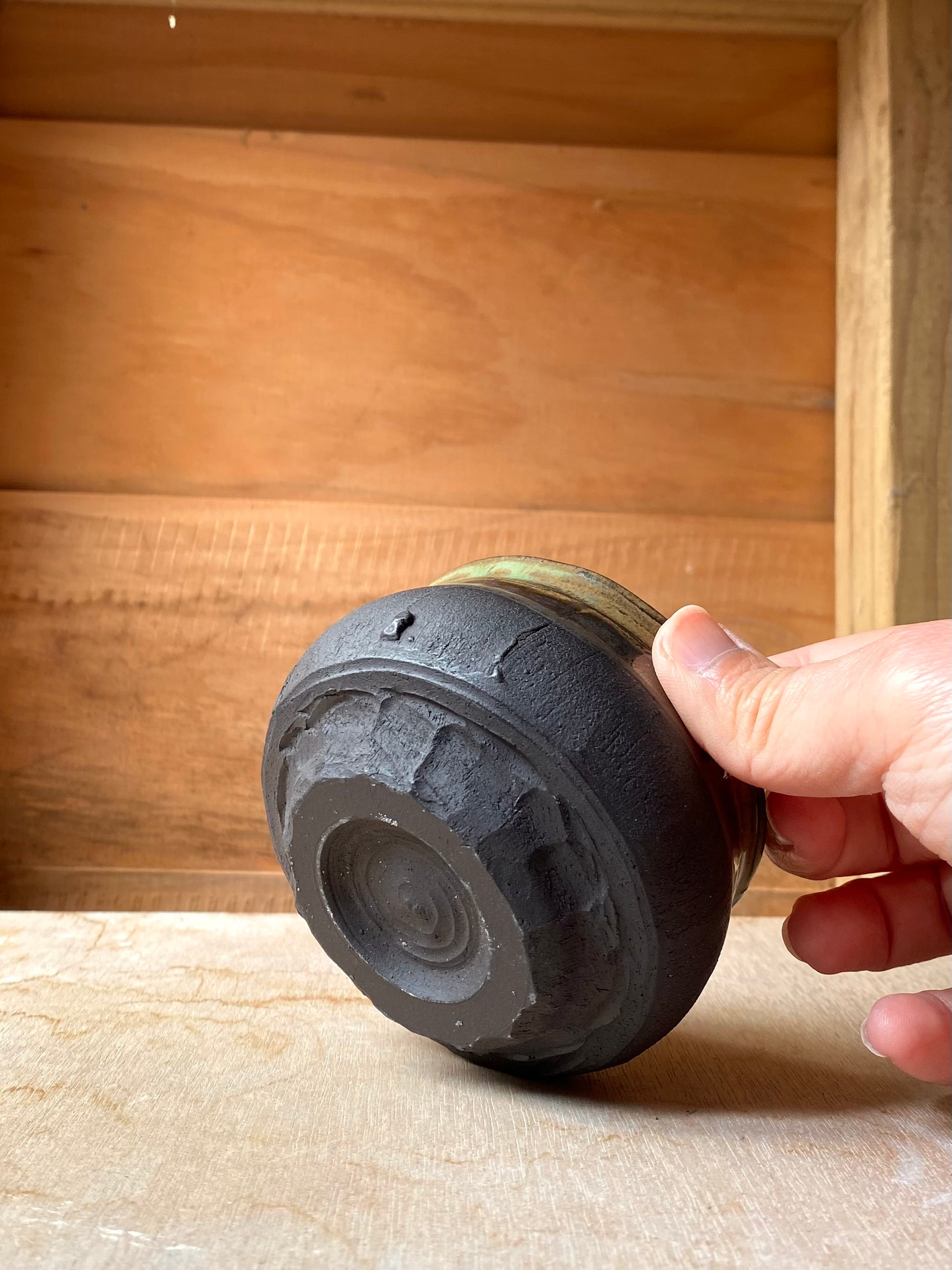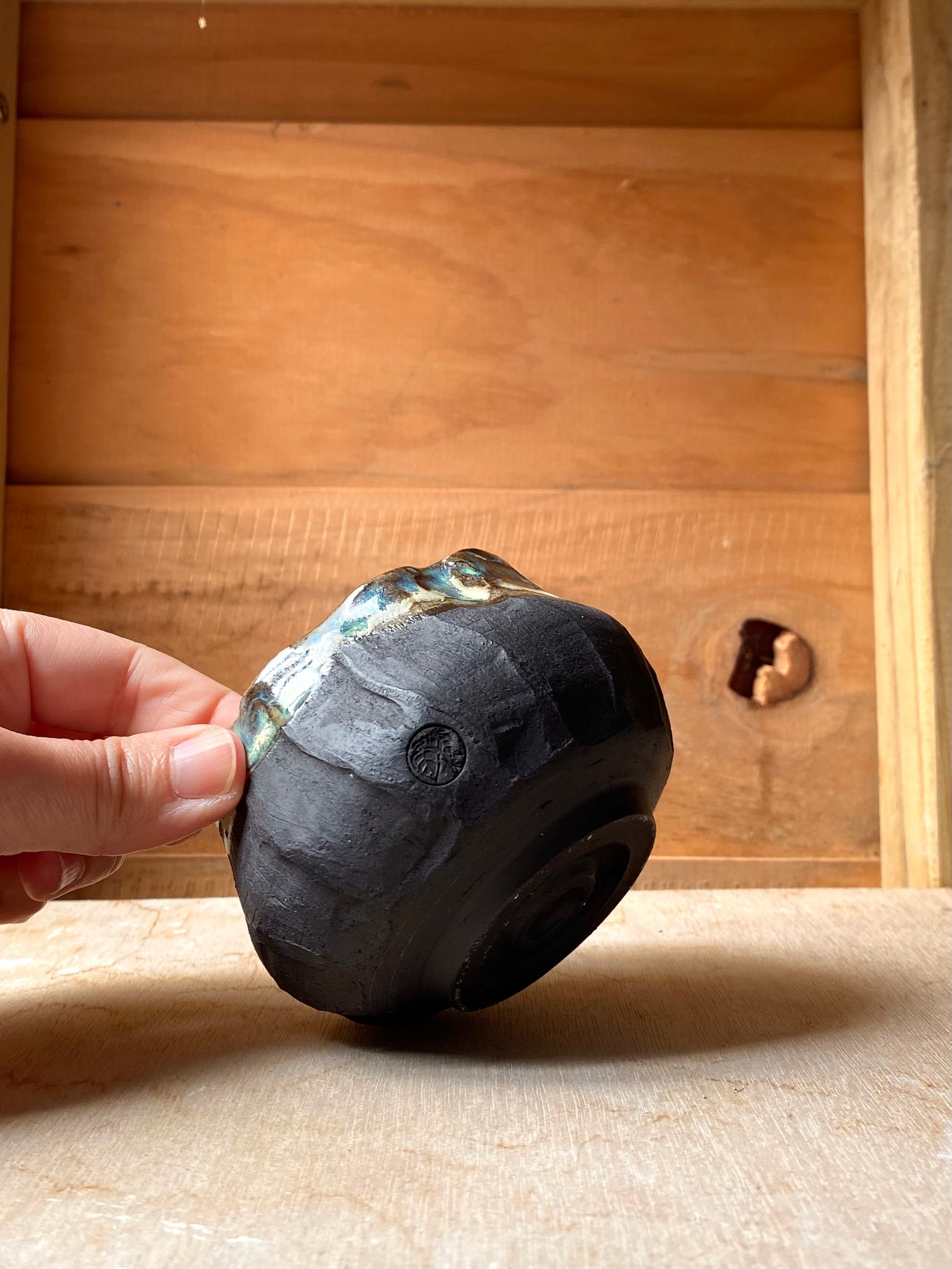 This cup is made from a mason stained black clay, hand thrown and hand carved.