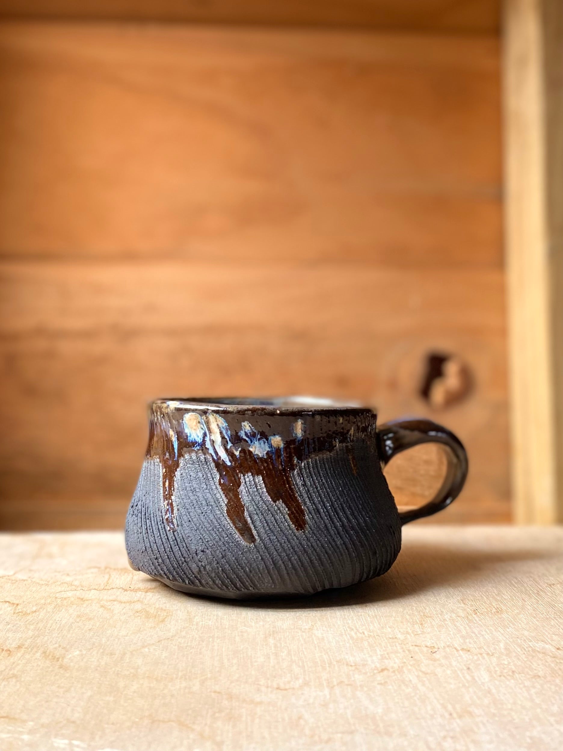 This mug is made from a mason stained black clay, hand thrown & trimmed on the wheel.